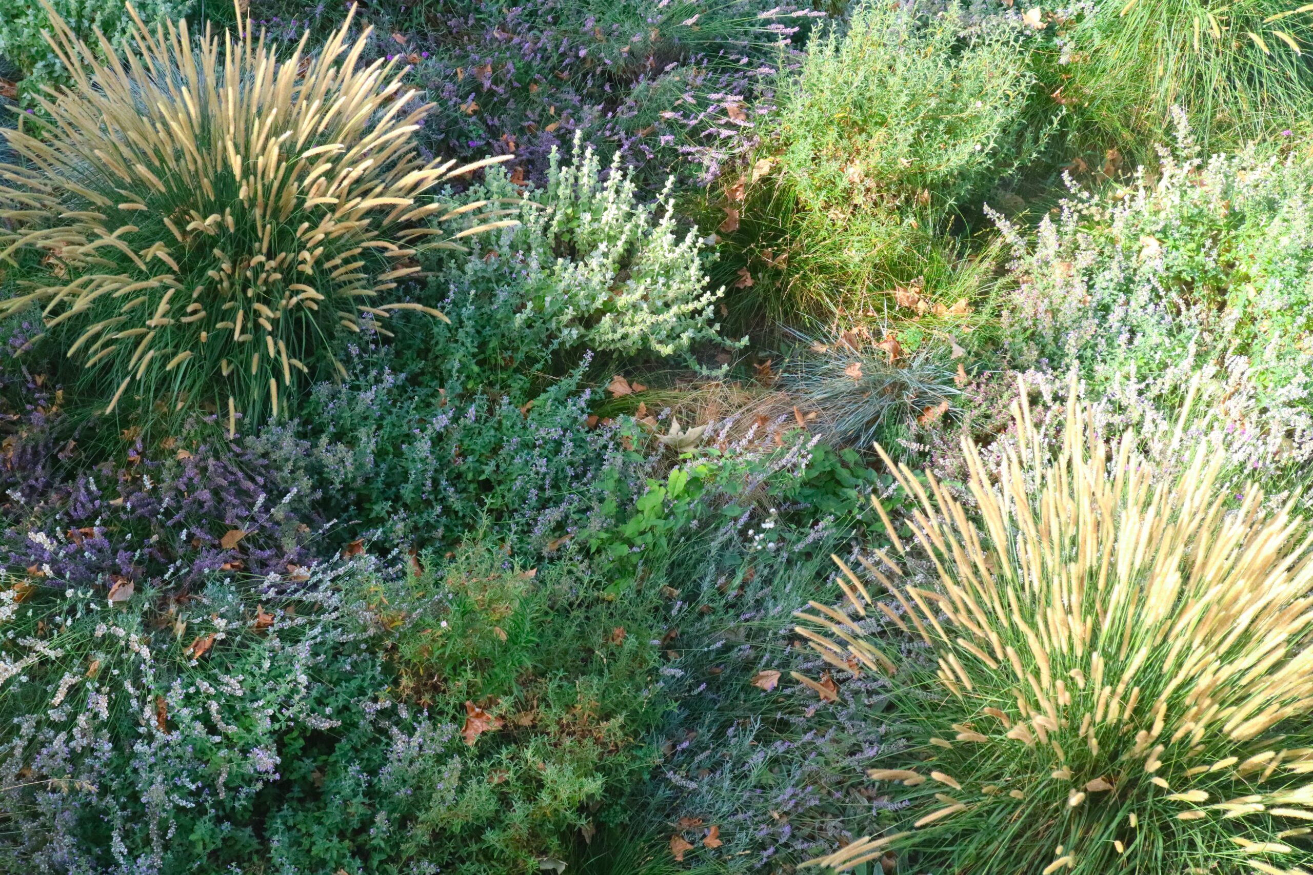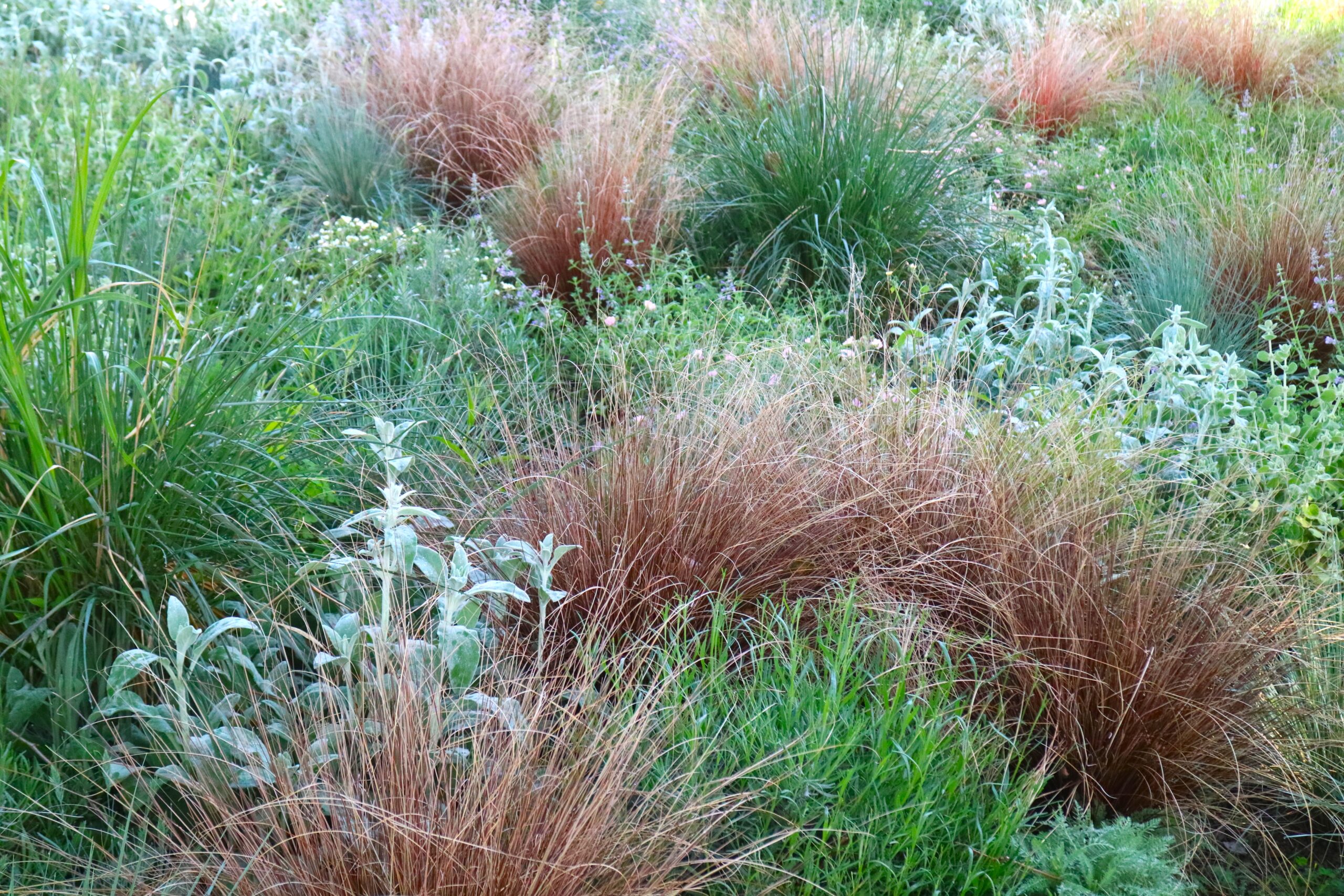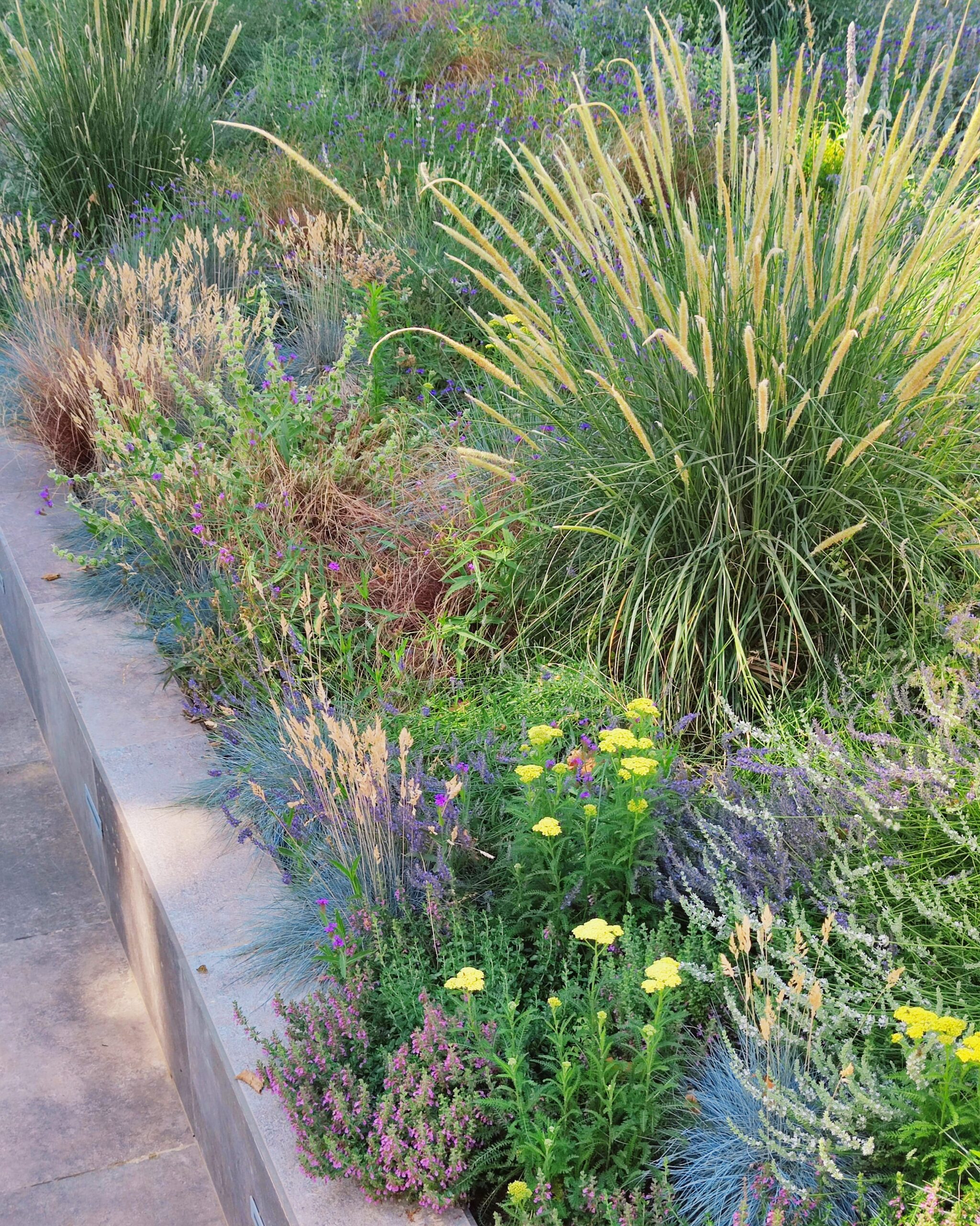 The rhythm of the planting is dictated by Pennisetum macrourum, used as a key structural plant that towers over the other species, creating a dynamic visual score.