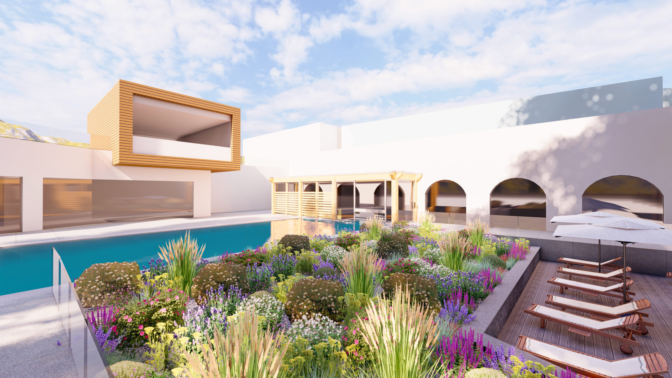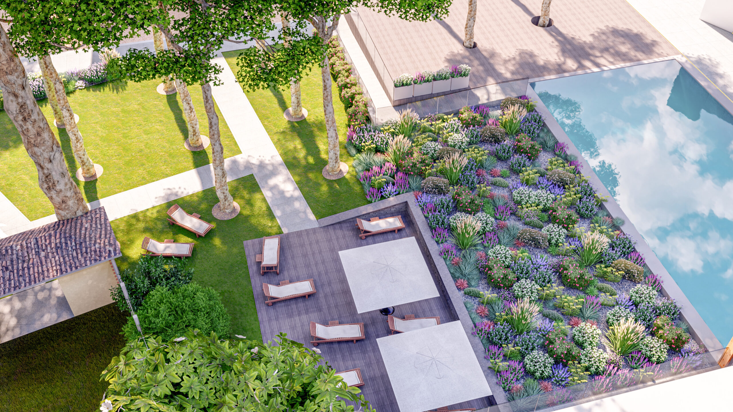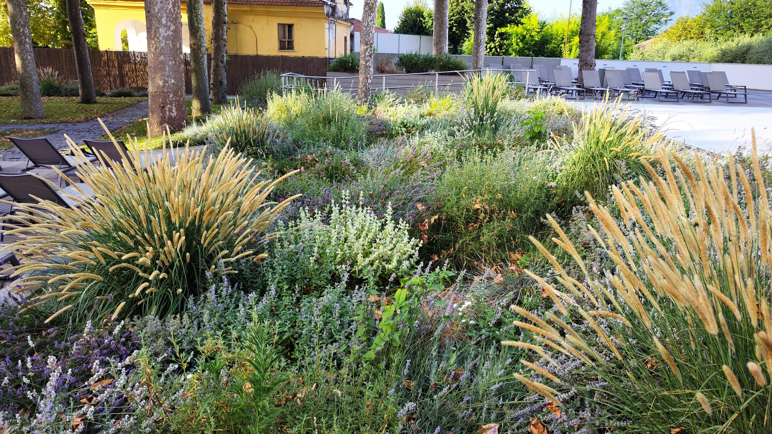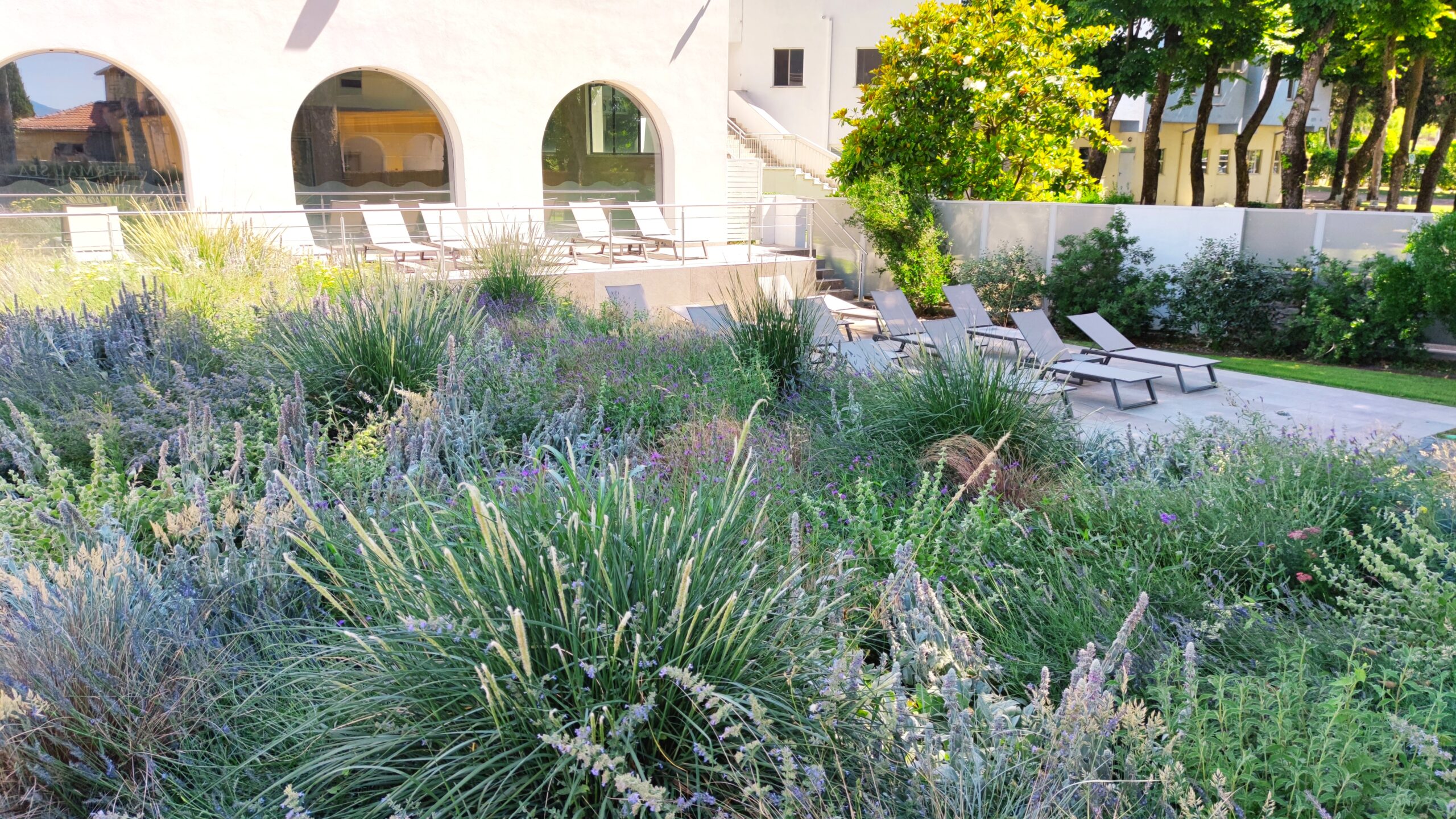 This choice also responds to sustainable water management, worthy of our studio: the selected species are perfectly adapted to the local conditions and, depending on the season, can survive the summer with little to no irrigation, thus combining lush aesthetics with ecological responsibility.