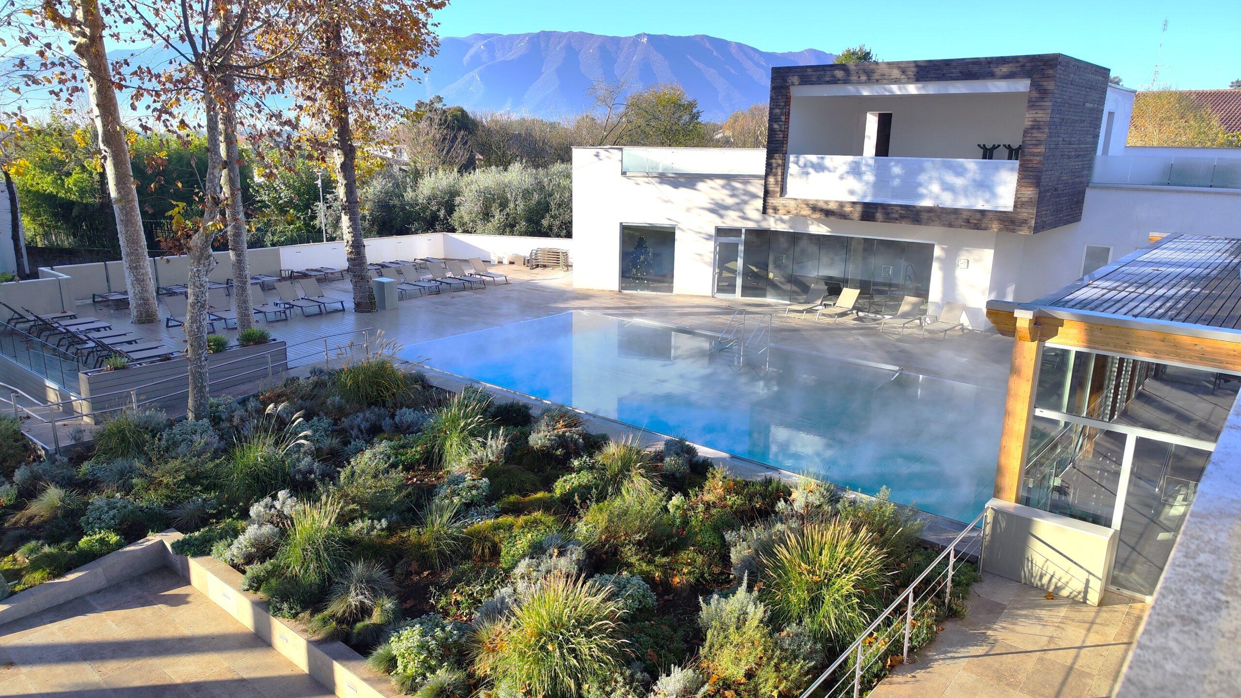 The garden was not conceived as a simple backdrop, but fuses organically with the modern architecture of the new wellness wing. We wanted to create a continuous dialogue between the built and the natural, transforming the thermal break into an immersive experience.