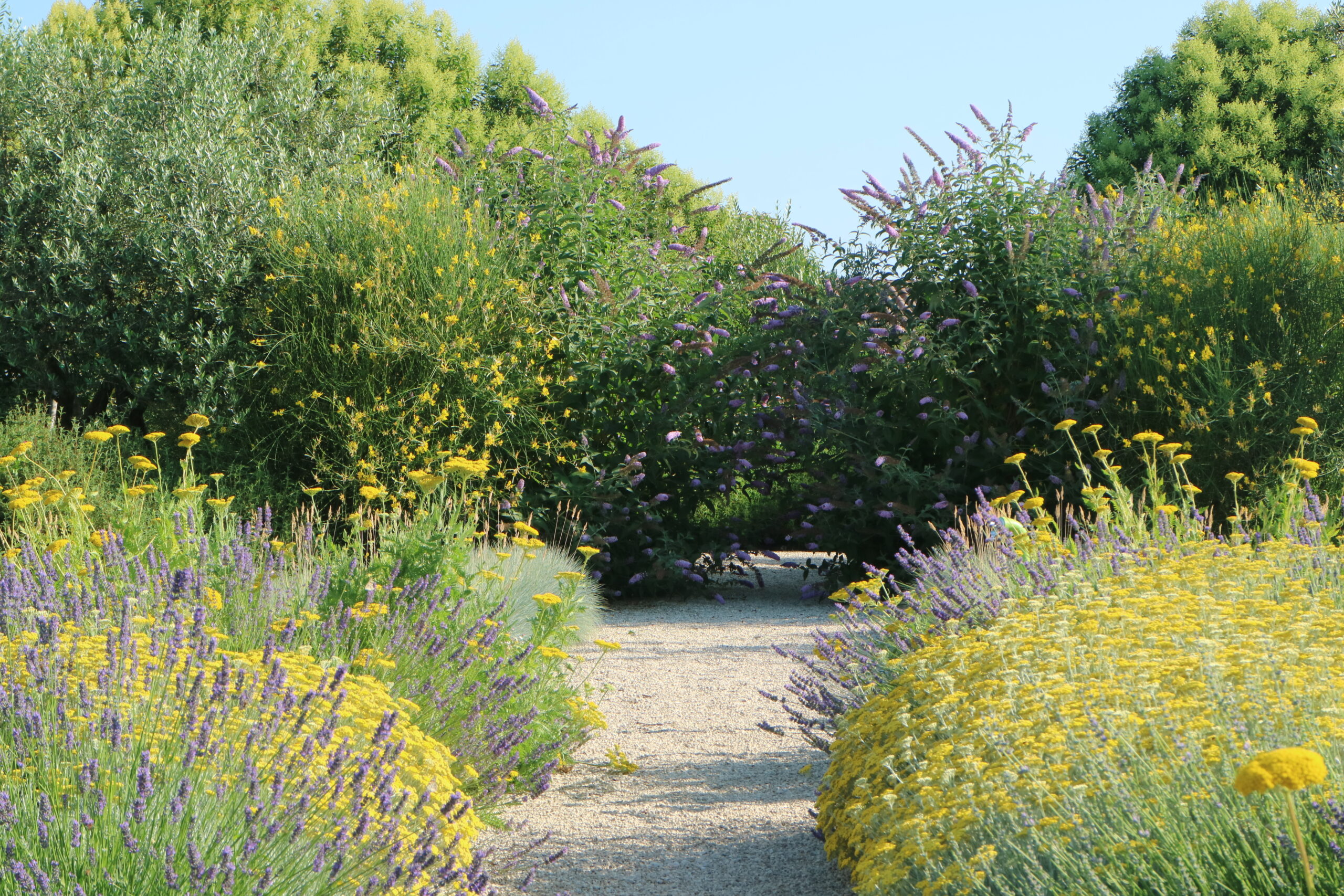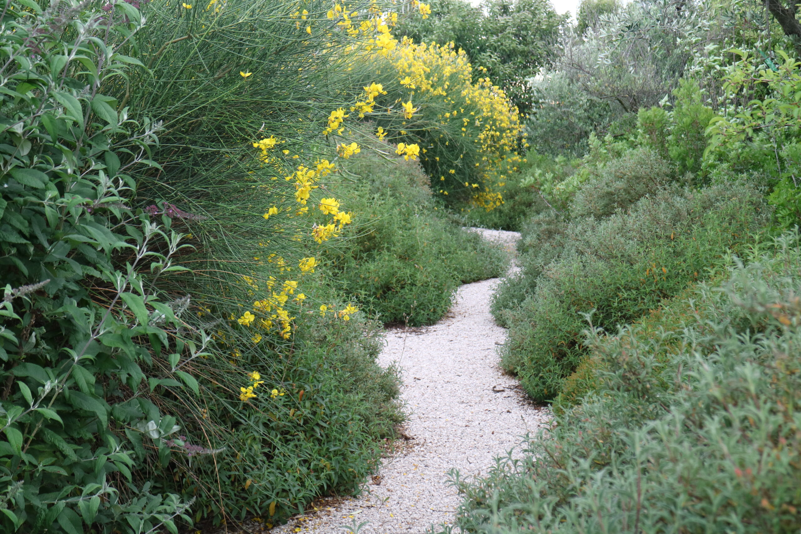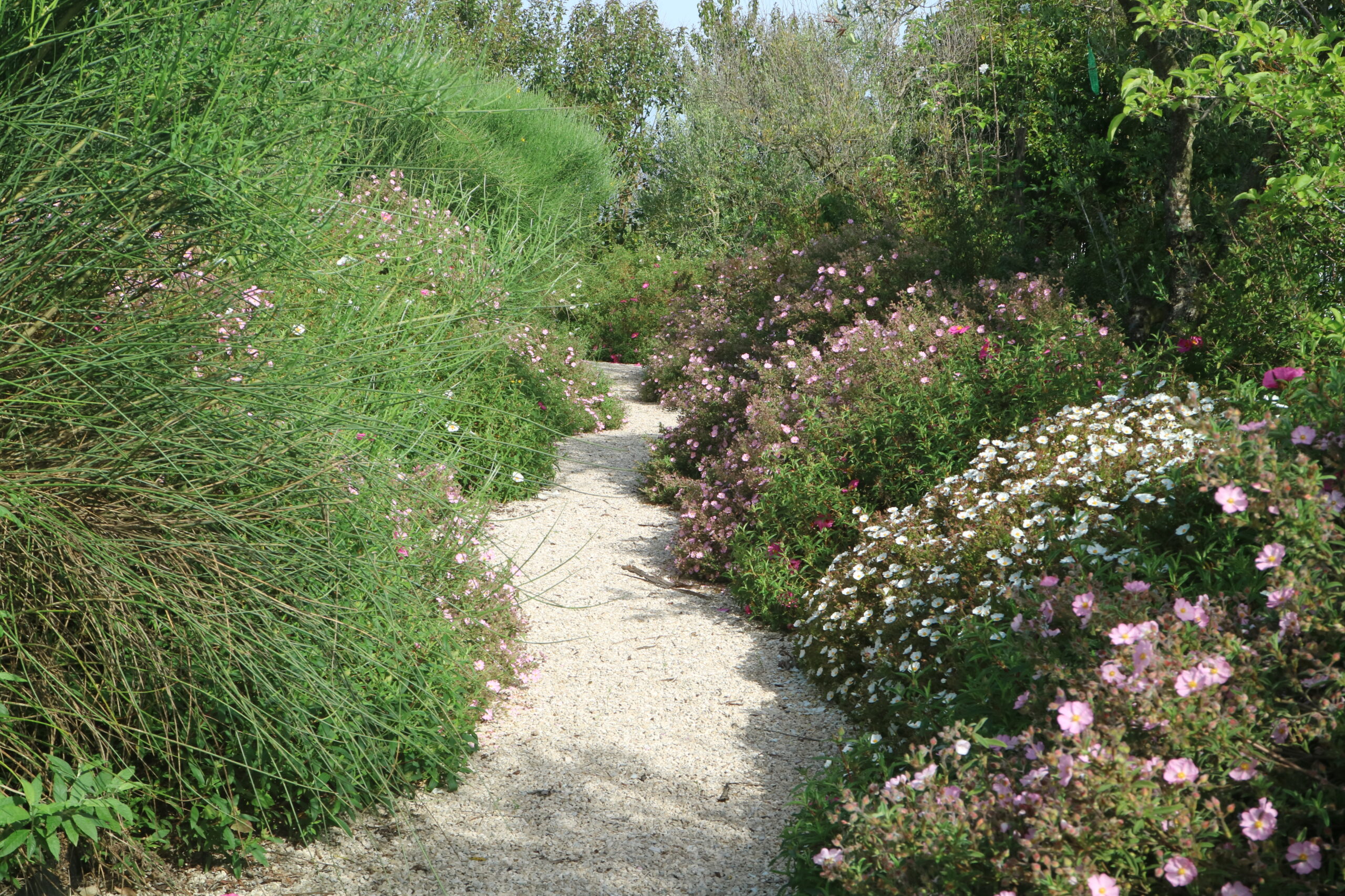 La selezione botanica è un inno alla macchia: Arbutus unedo, Myrtus communis e Phillyrea angustifolia creano quinte che ritemprano lo spirito. Cistus e Teucrium donano struttura, mentre un rifugio per le farfalle, tra Buddleja e Verbena, porta vibrazione vitale.