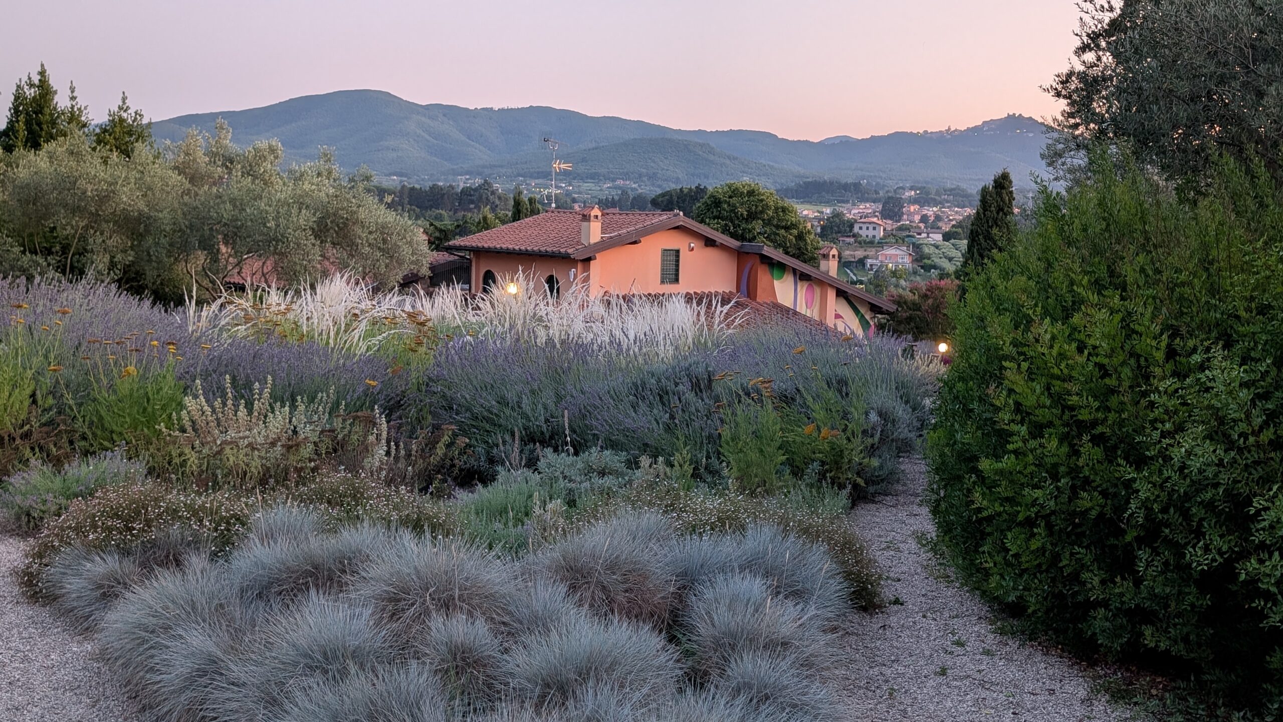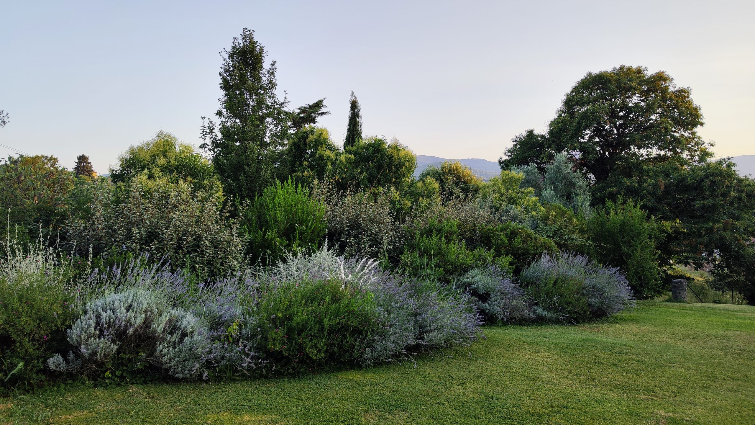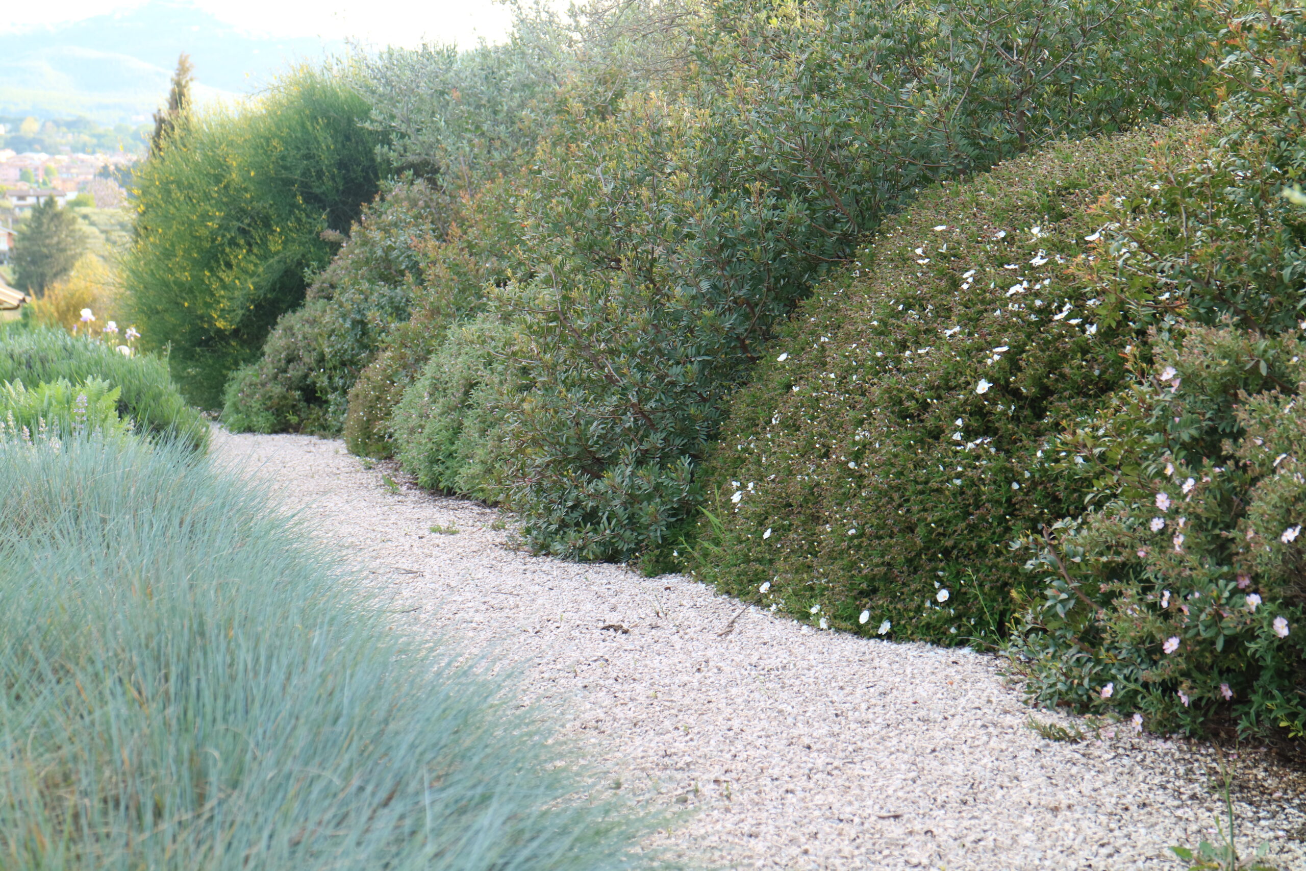La selezione botanica è un inno alla macchia: Arbutus unedo, Myrtus communis e Phillyrea angustifolia creano quinte che ritemprano lo spirito. Cistus e Teucrium donano struttura, mentre un rifugio per le farfalle, tra Buddleja e Verbena, porta vibrazione vitale.