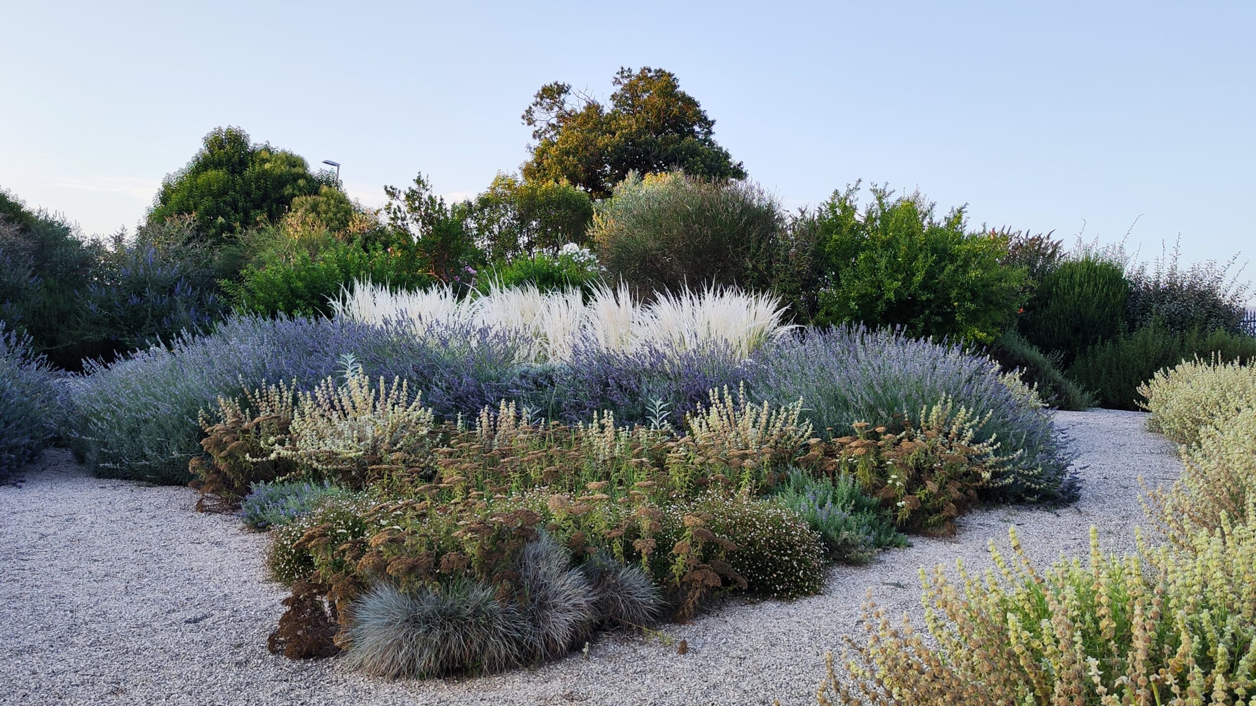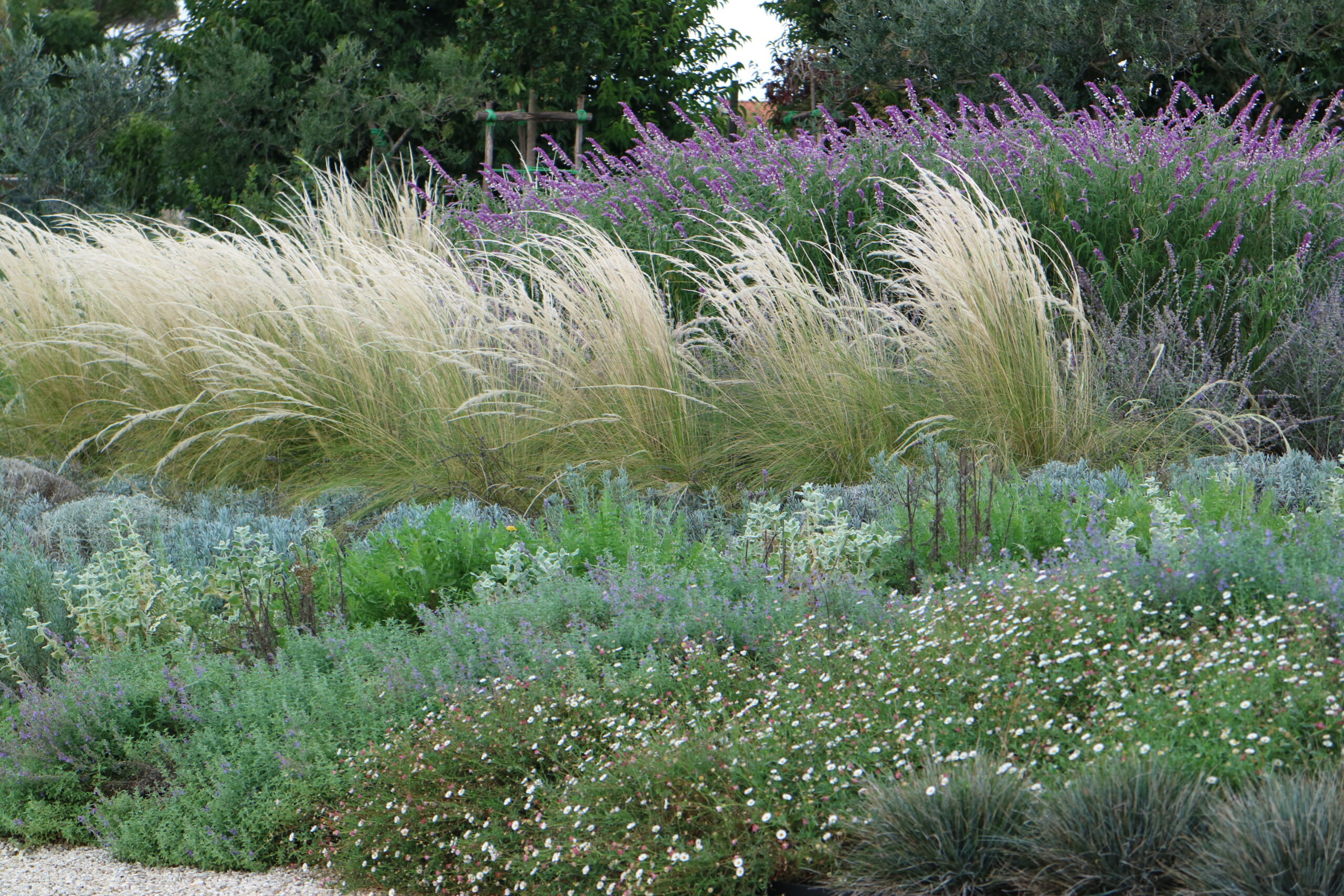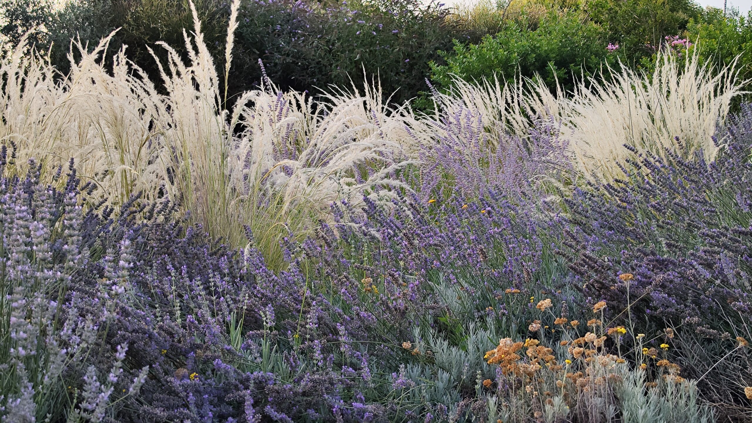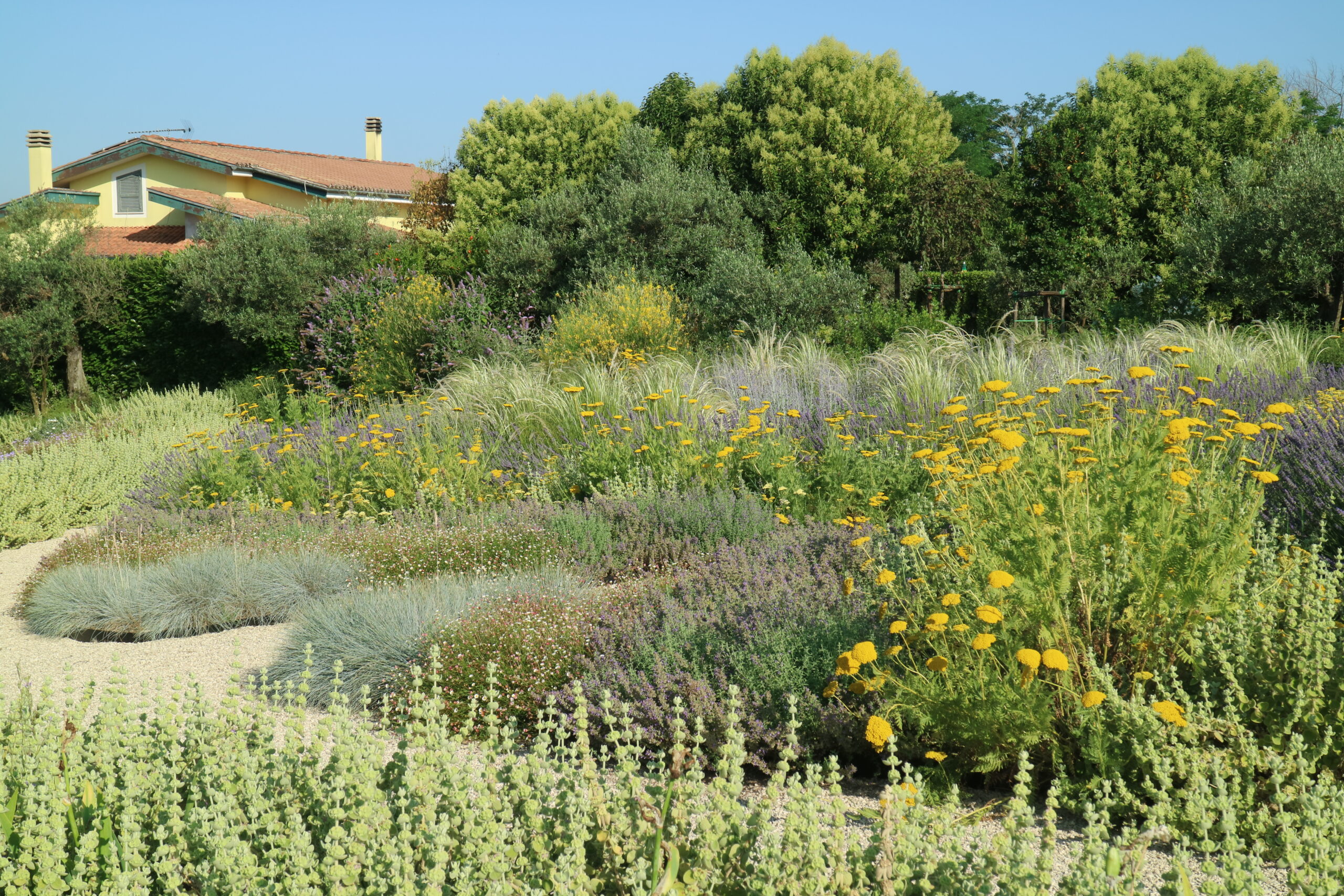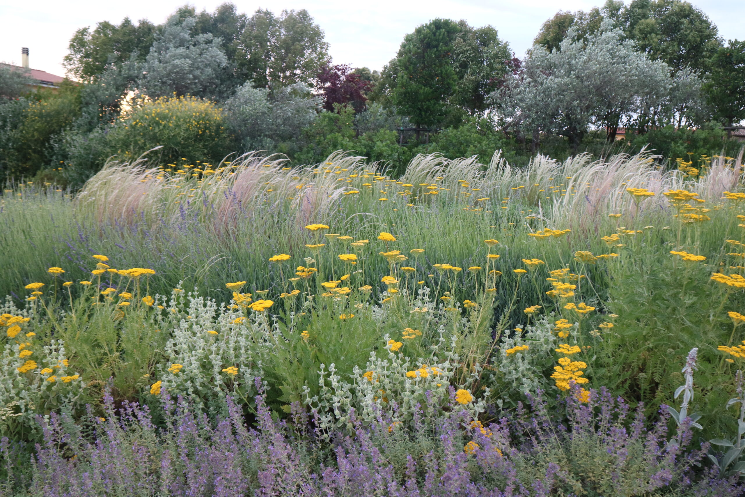 Le aree centrali sono un intreccio di texture vibranti. Stipa tenuifolia e Festuca glauca danzano al vento accanto alle note di Lavandula e Perovskia. Convolvulus ed Erigeron velano la terra con delicatezza.