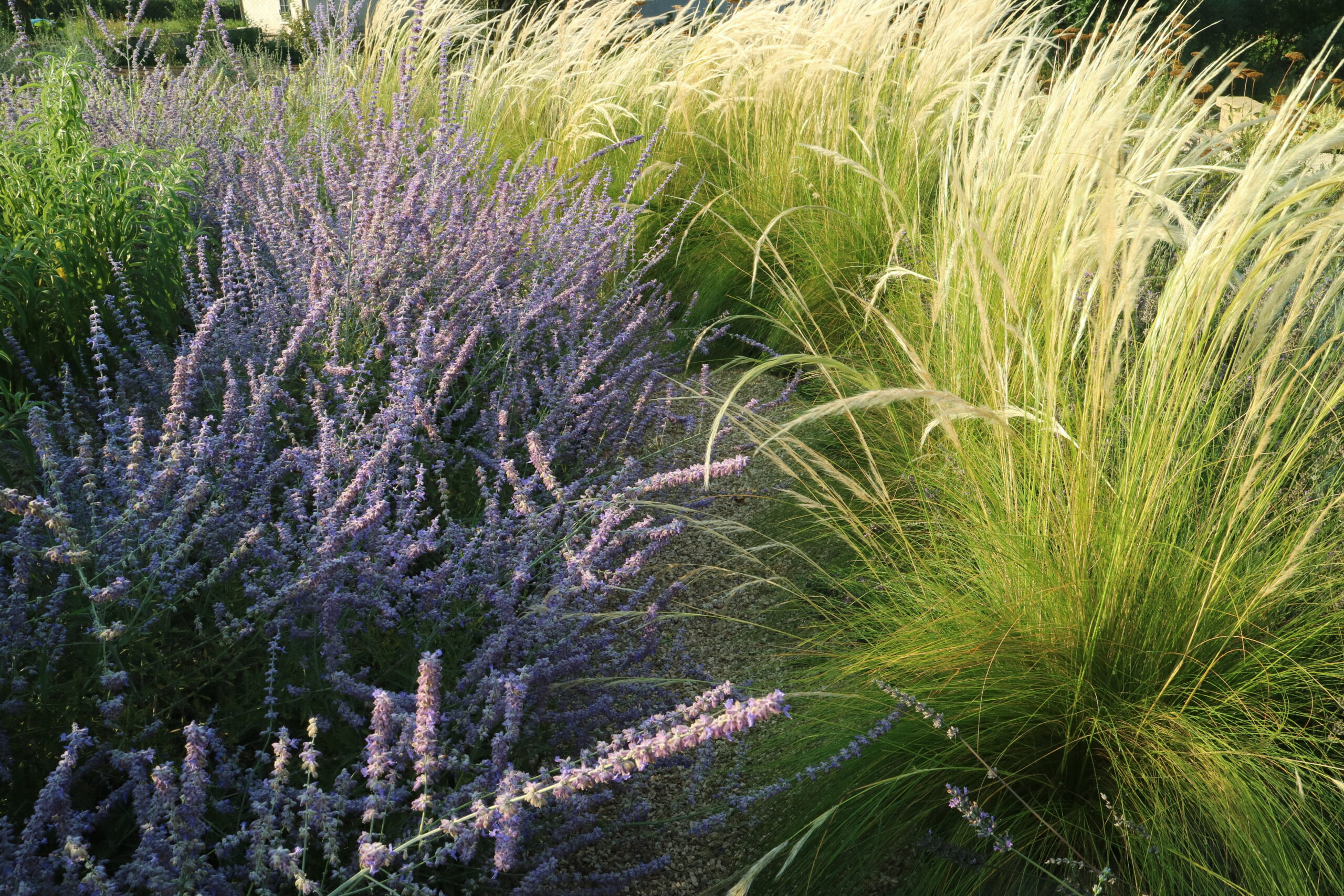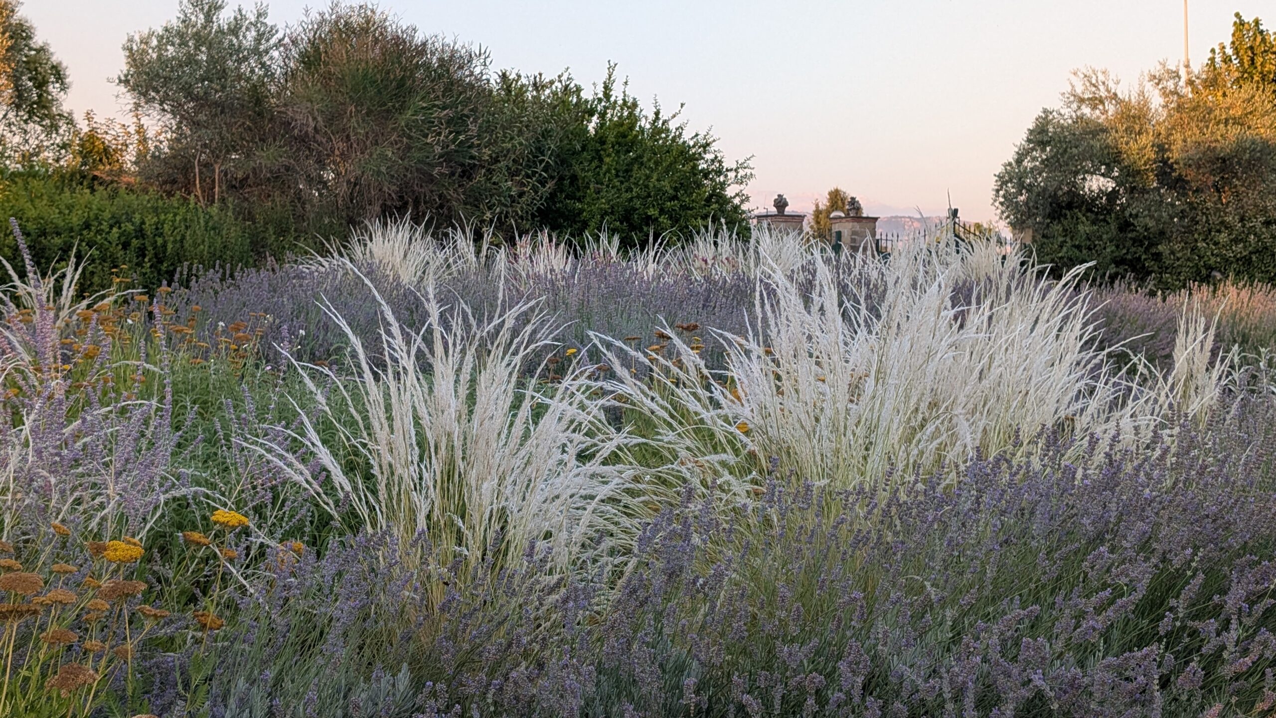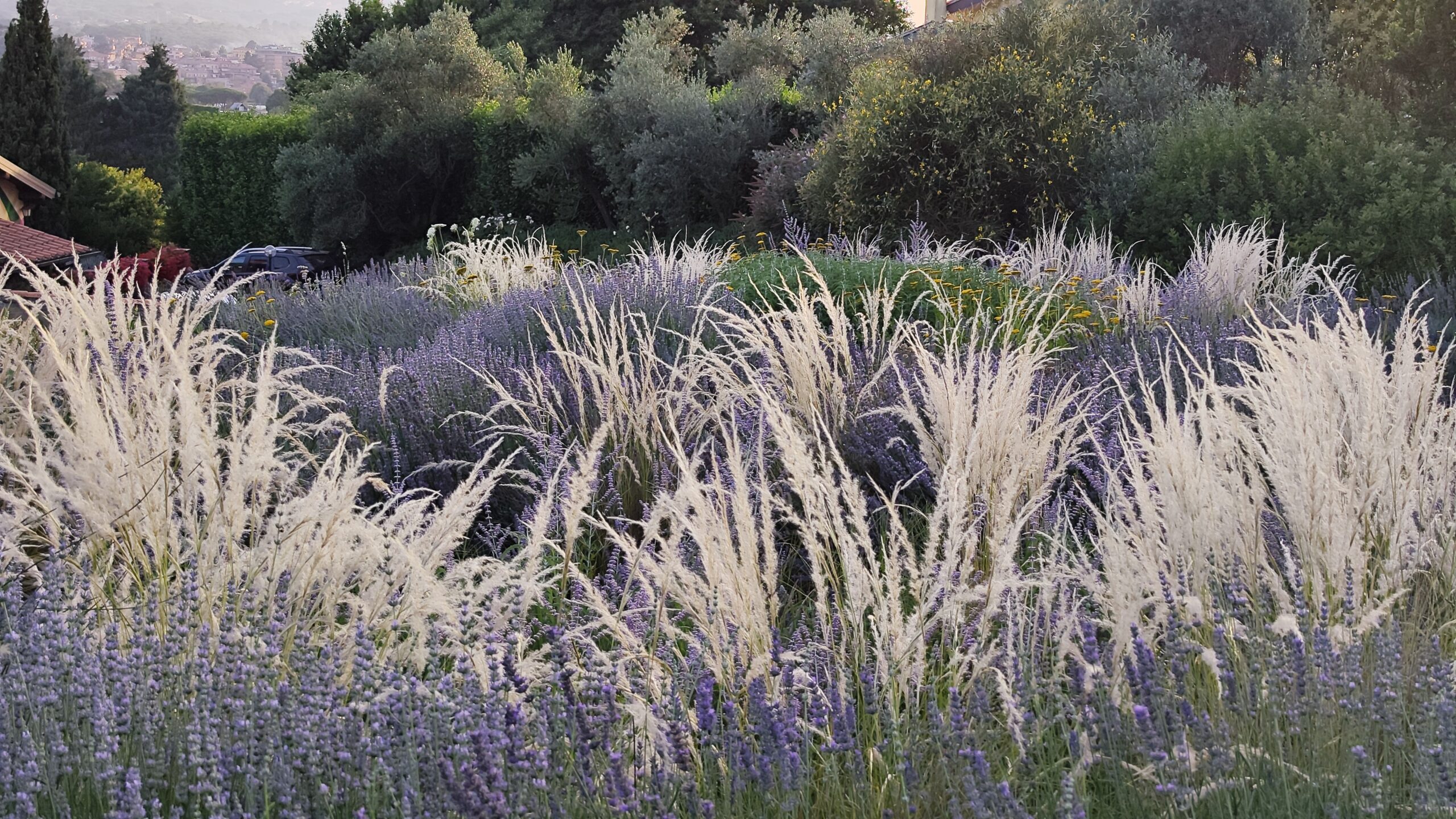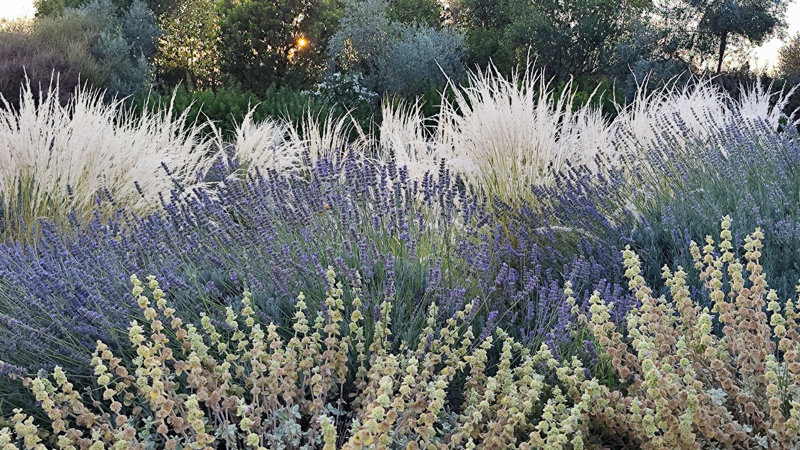 Le aree centrali sono un intreccio di texture vibranti. Stipa tenuifolia e Festuca glauca danzano al vento accanto alle note di Lavandula e Perovskia. Convolvulus ed Erigeron velano la terra con delicatezza.