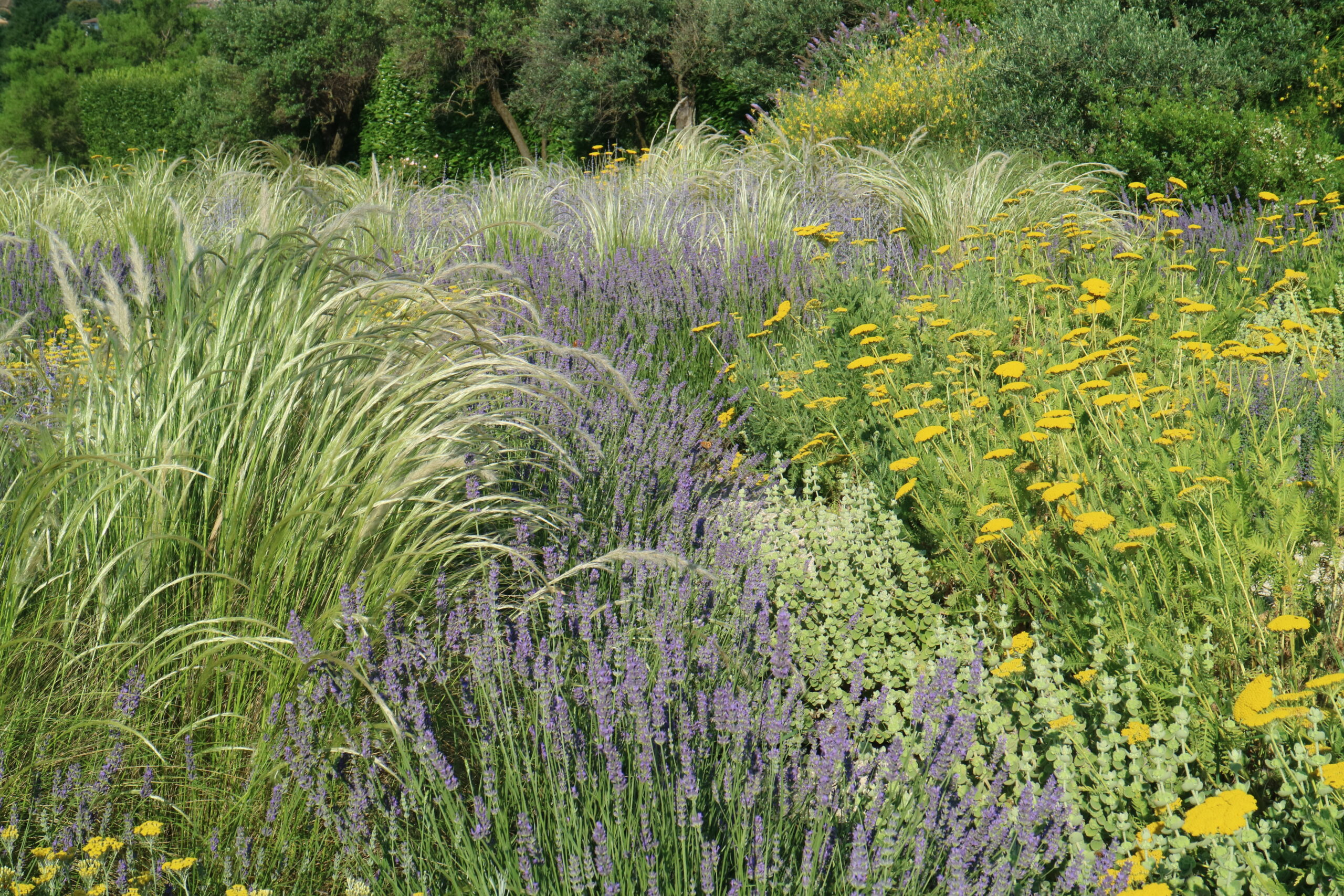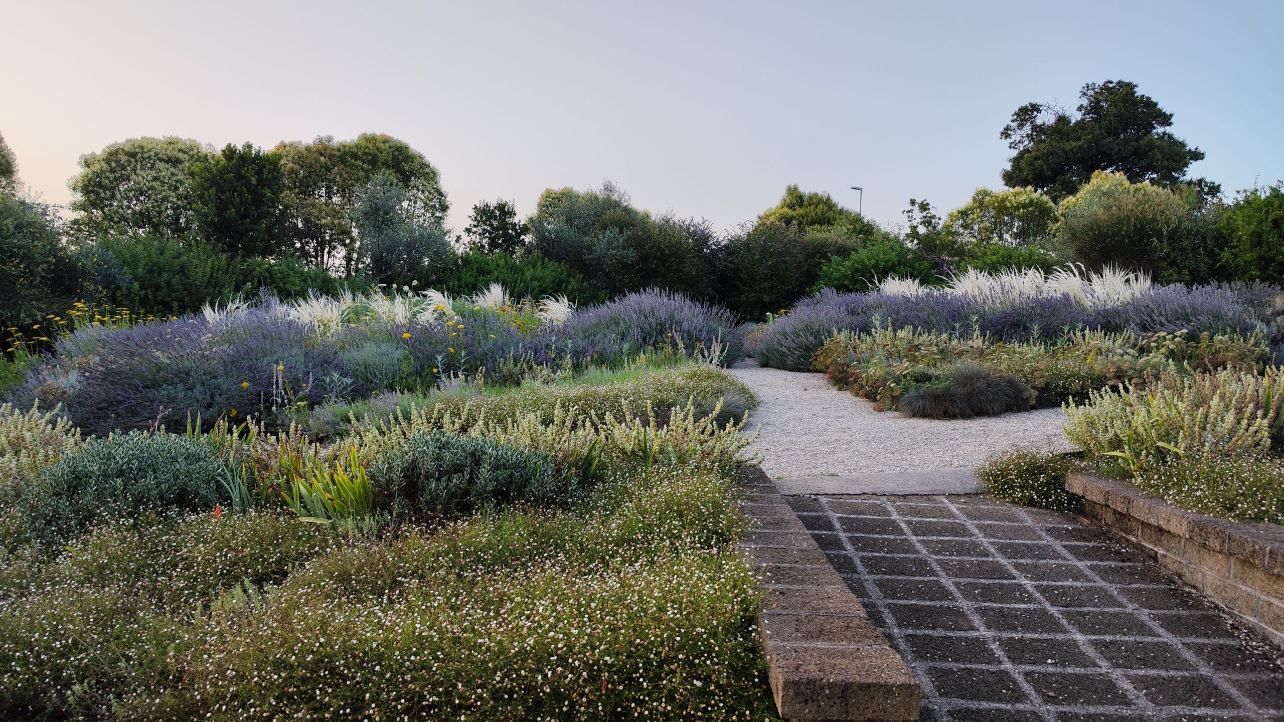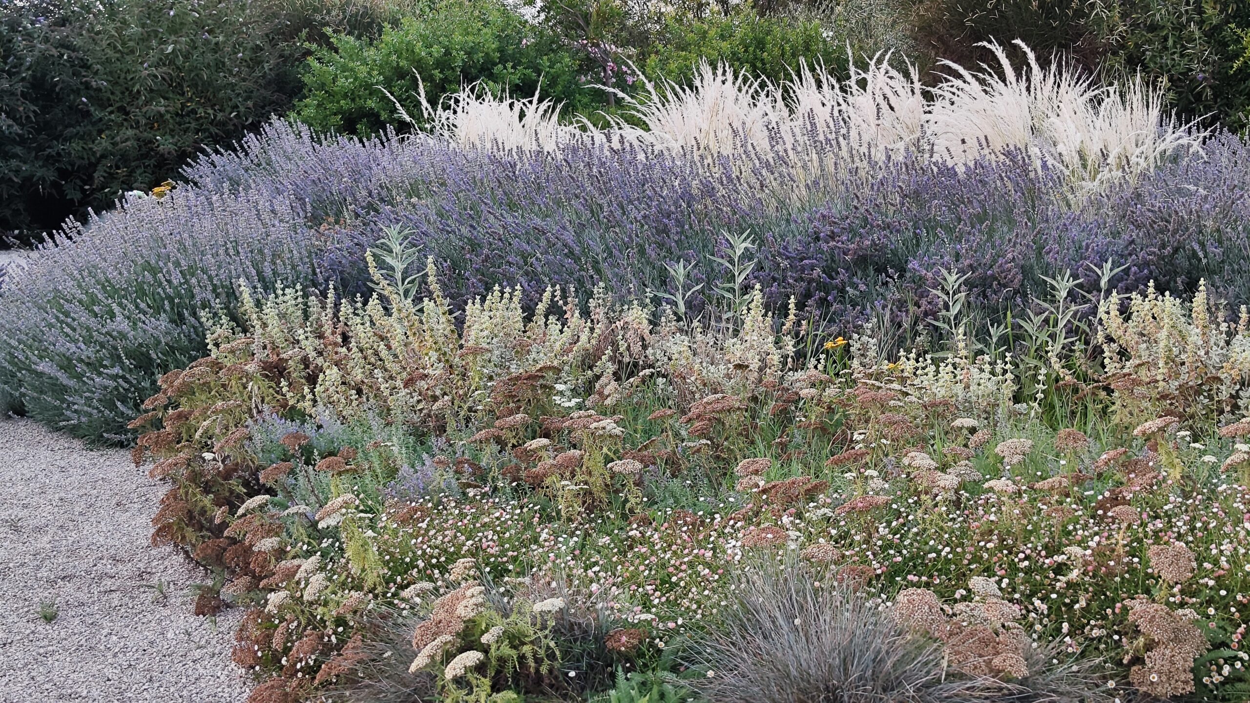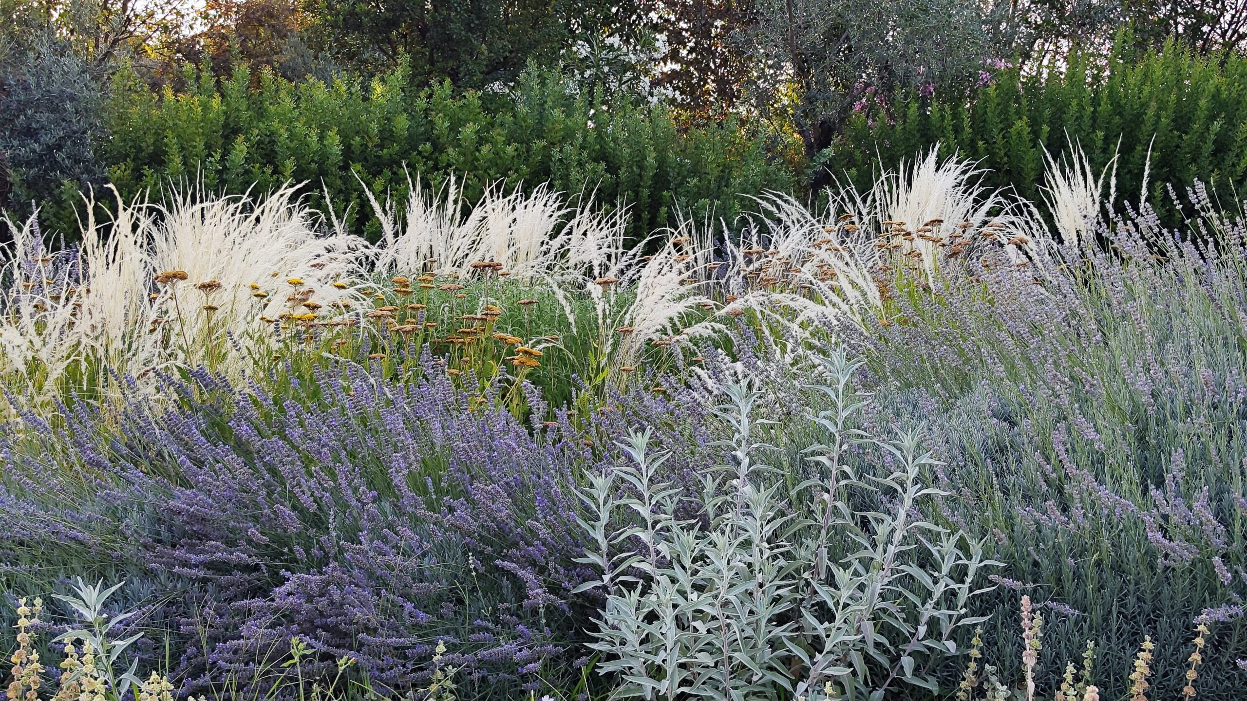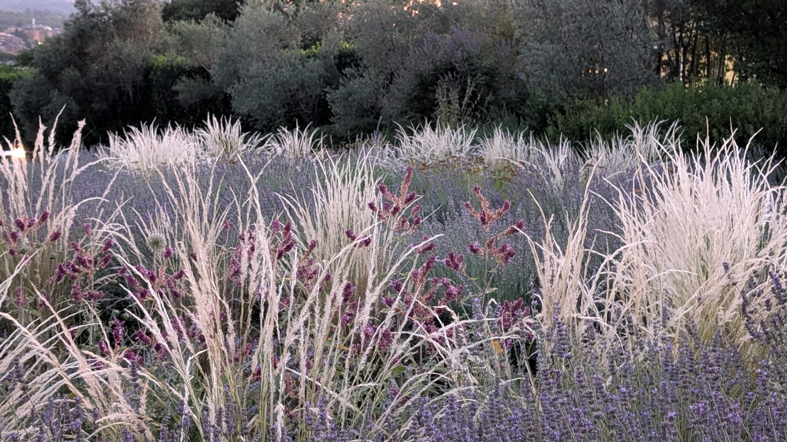 Le aree centrali sono un intreccio di texture vibranti. Stipa tenuifolia e Festuca glauca danzano al vento accanto alle note di Lavandula e Perovskia. Convolvulus ed Erigeron velano la terra con delicatezza.