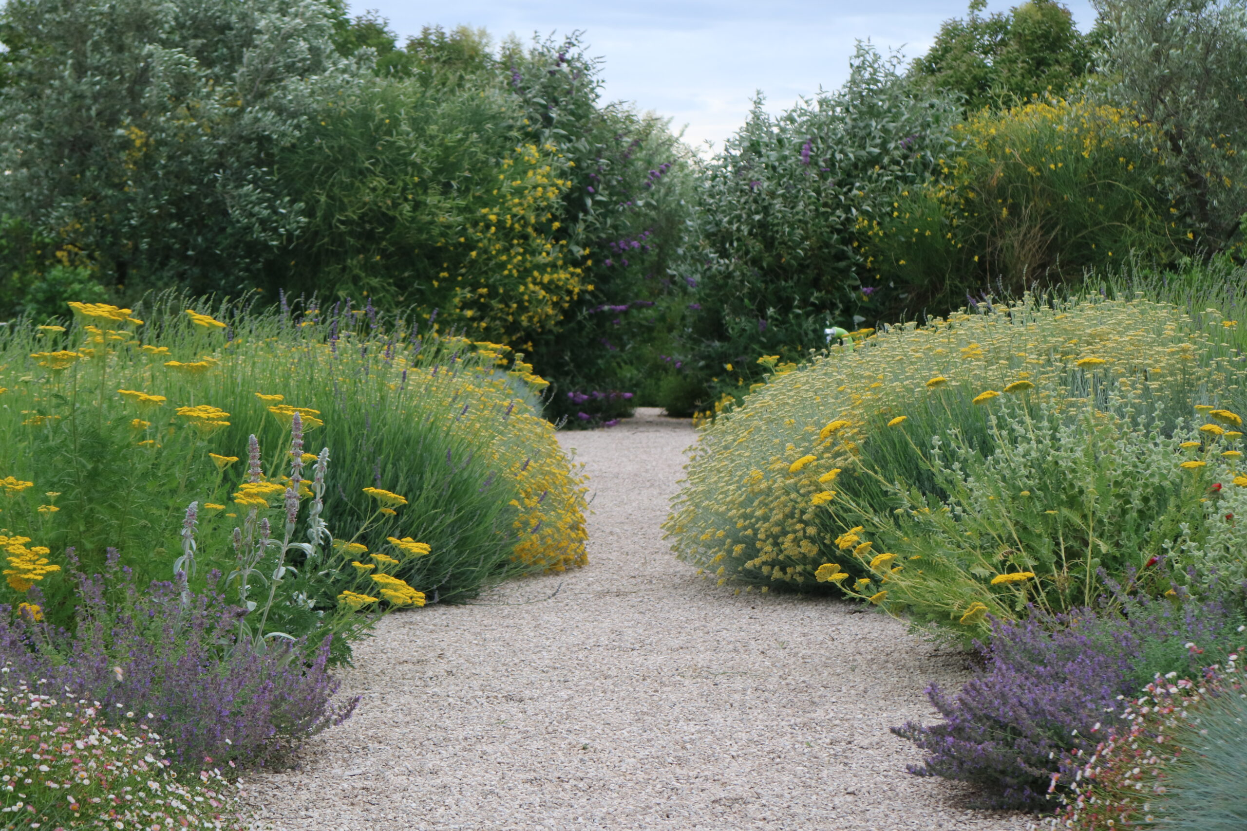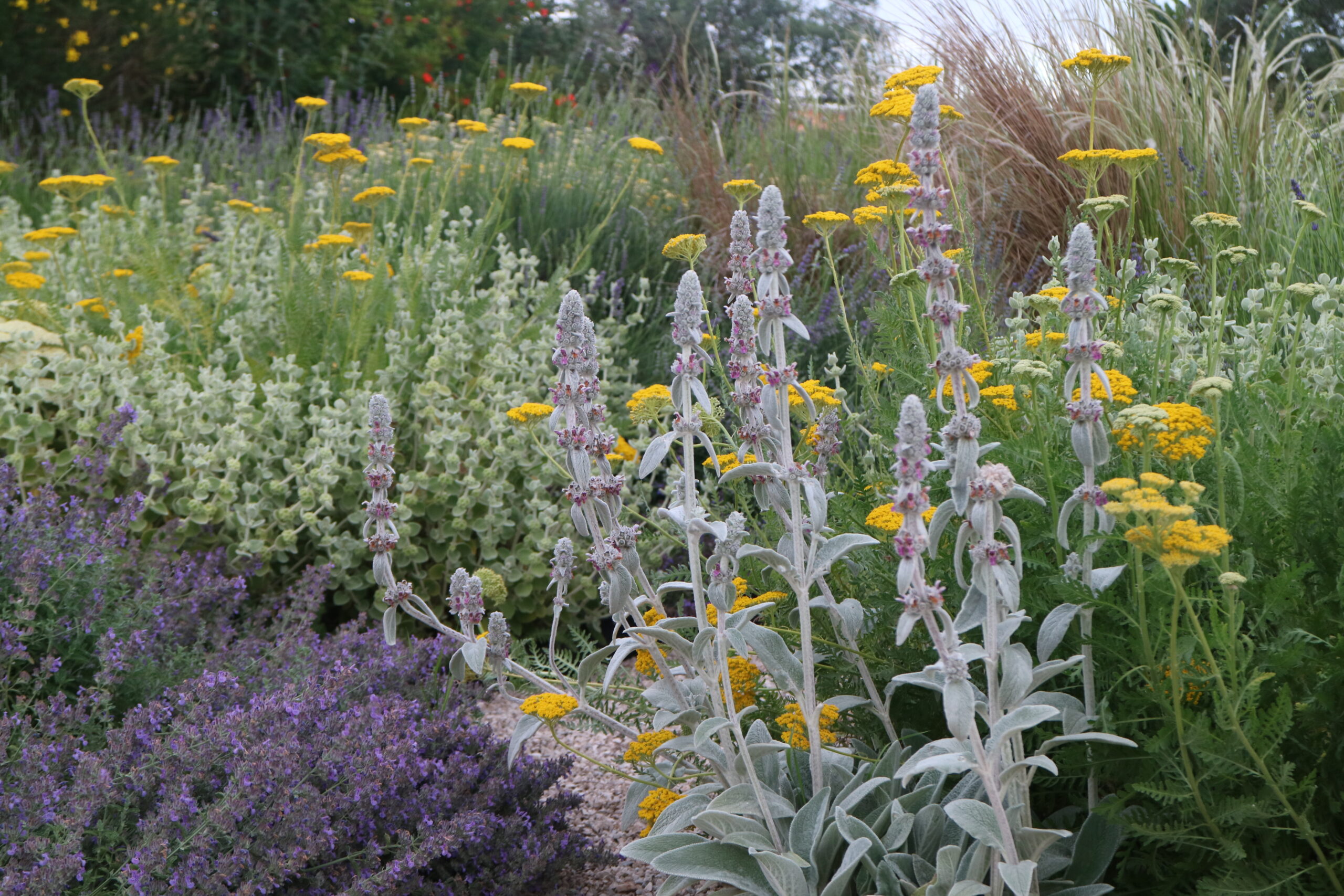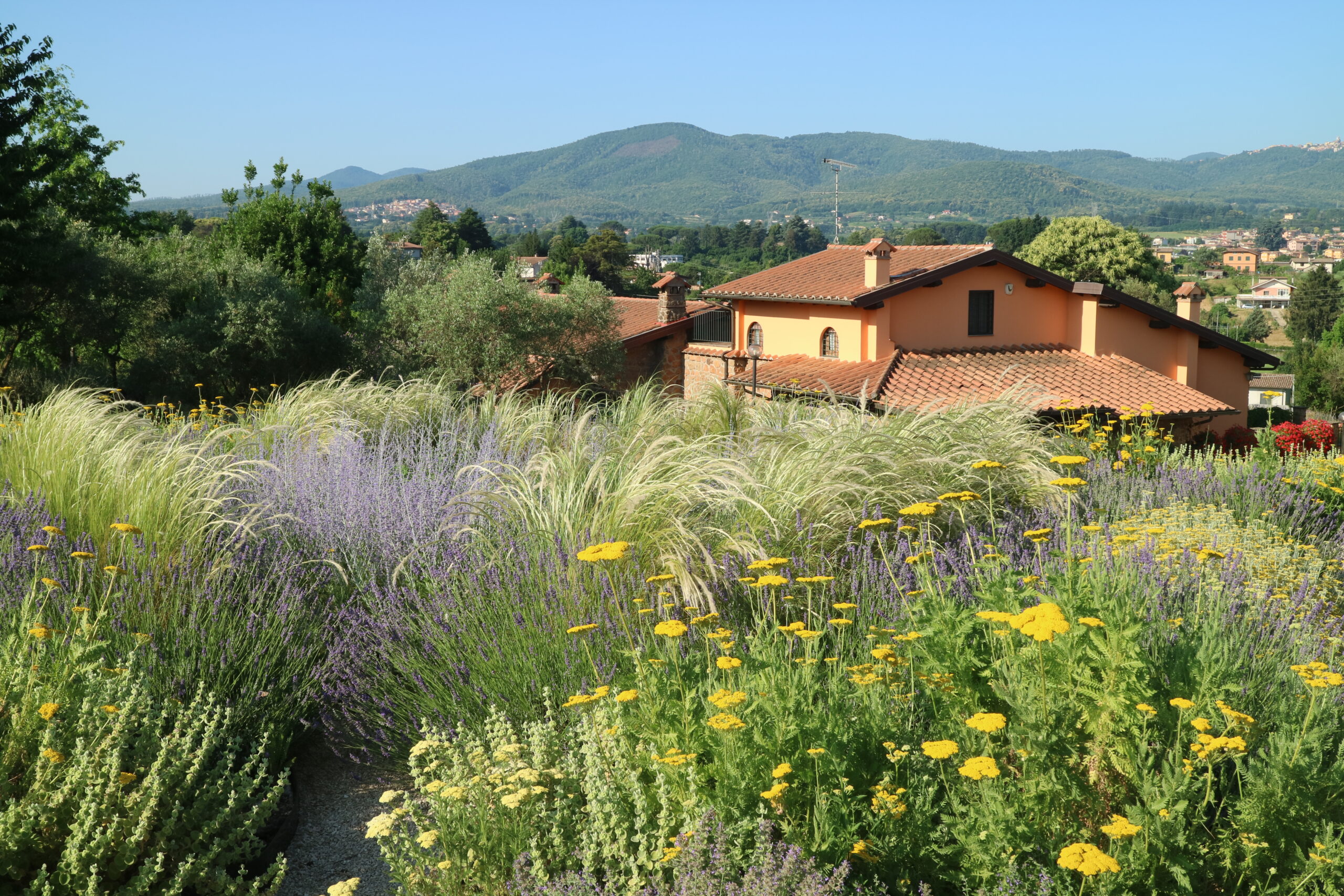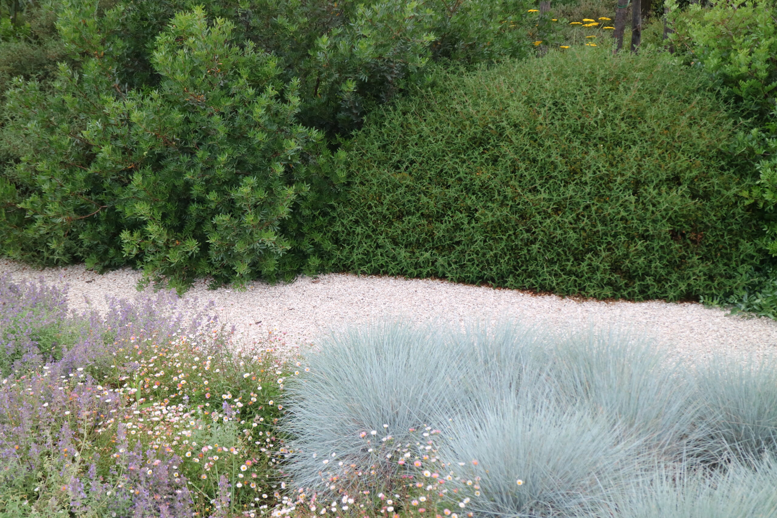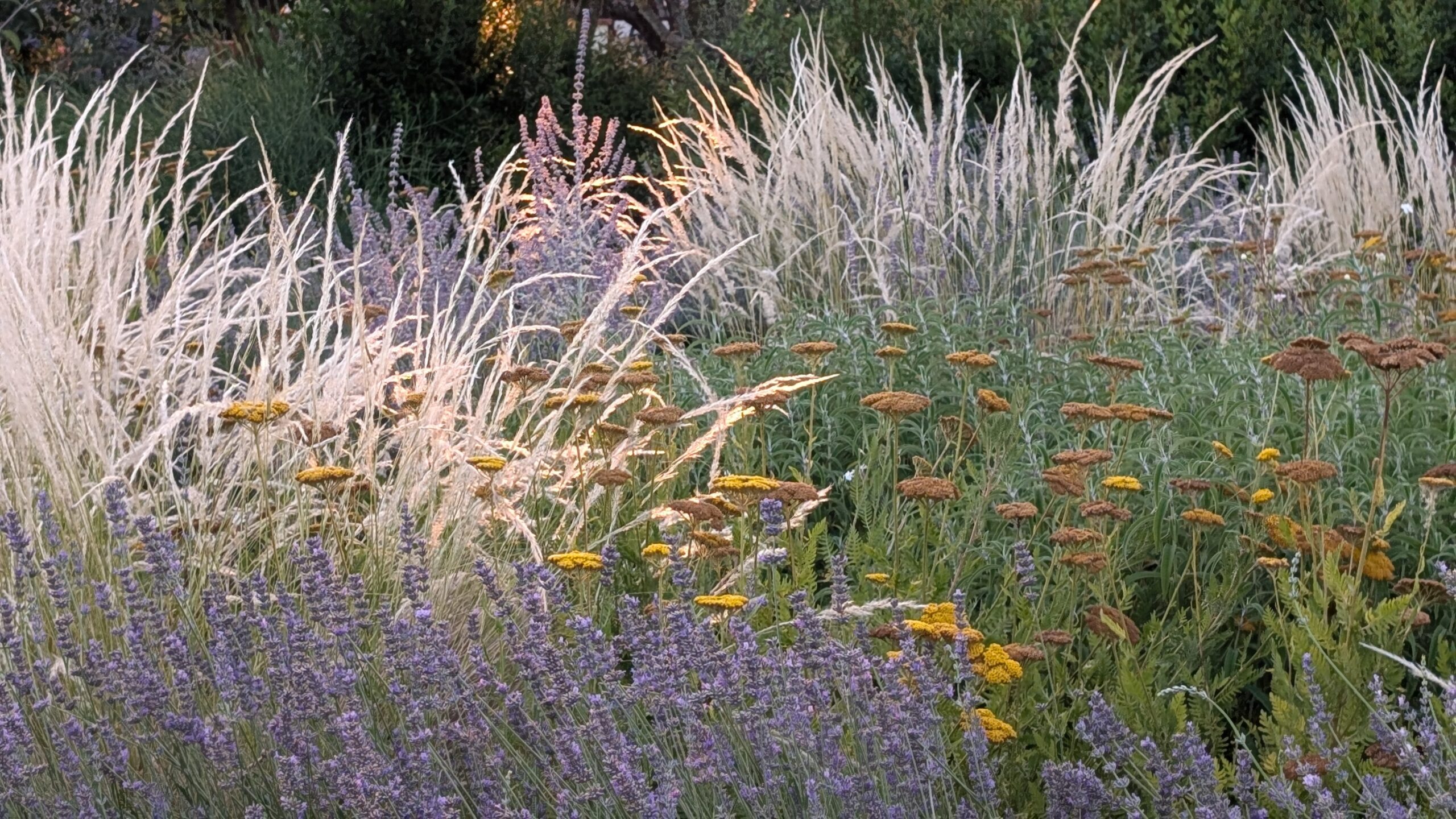 Le aree centrali sono un intreccio di texture vibranti. Stipa tenuifolia e Festuca glauca danzano al vento accanto alle note di Lavandula e Perovskia. Convolvulus ed Erigeron velano la terra con delicatezza.