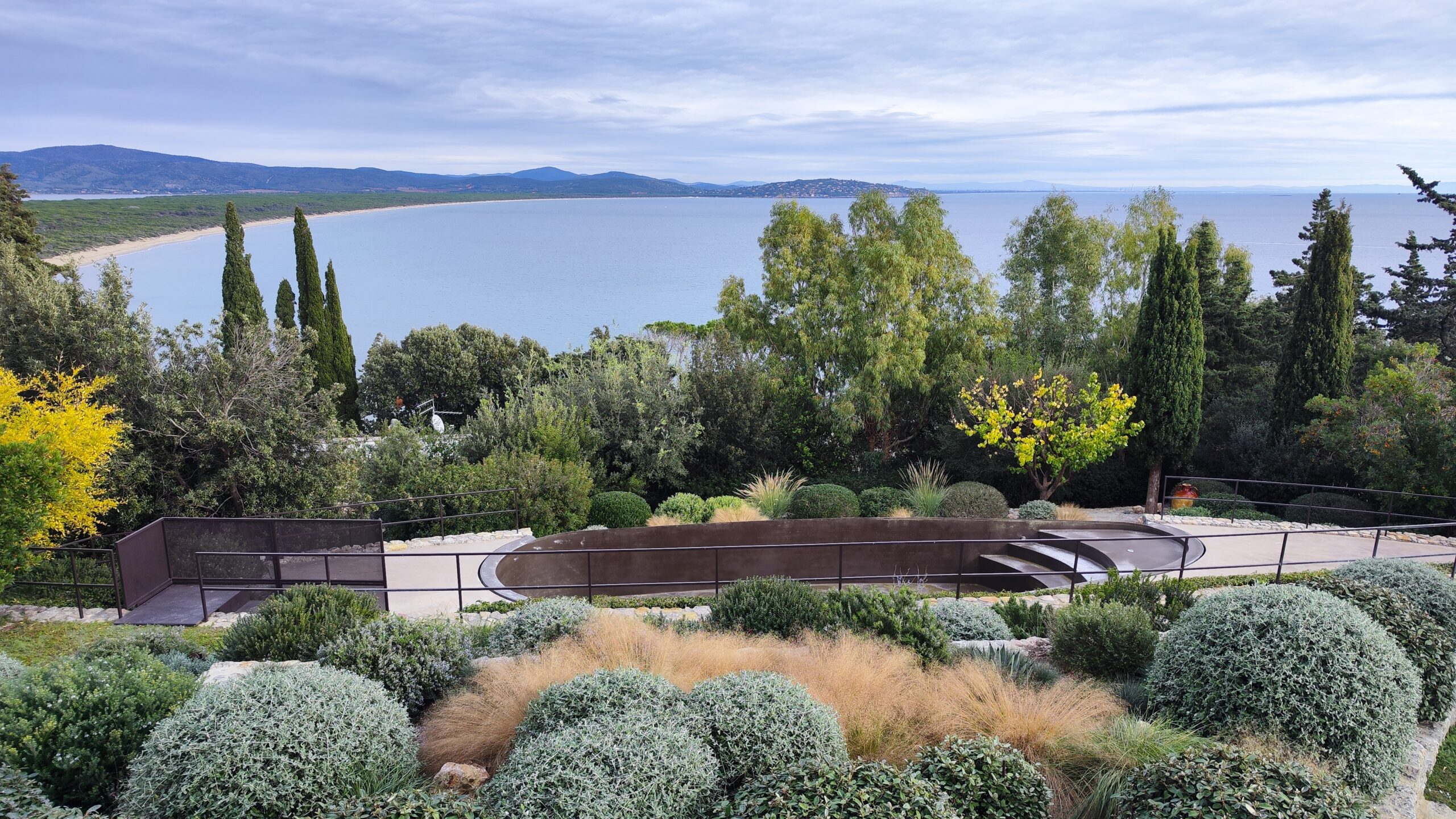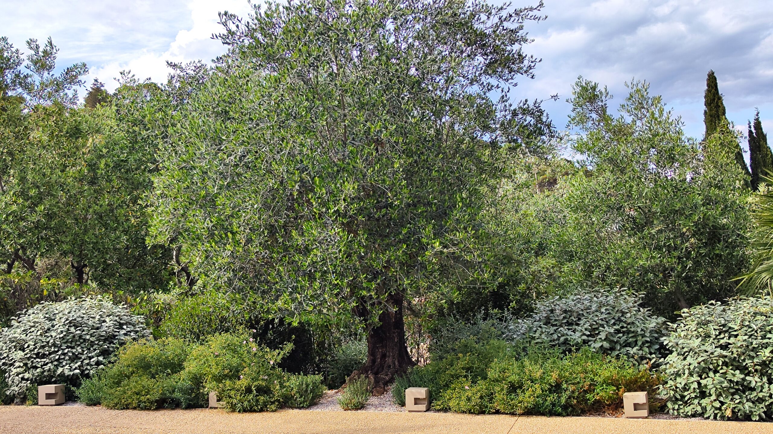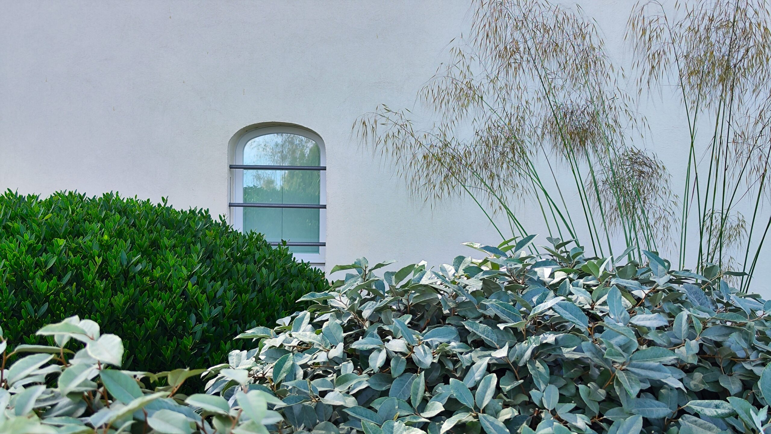 La struttura portante è affidata a Pistacia lentiscus, Phillyrea angustifolia ed Elaeagnus x ebbingei, mantenute in forme sferiche.