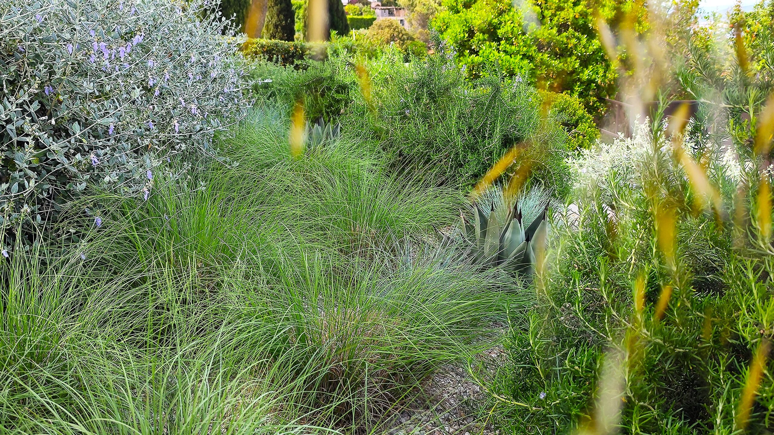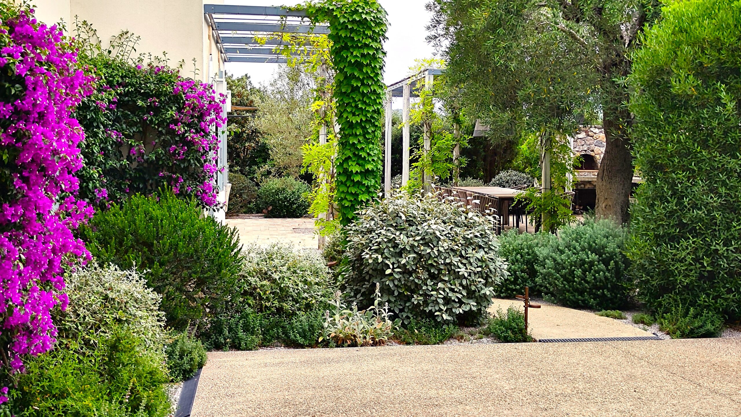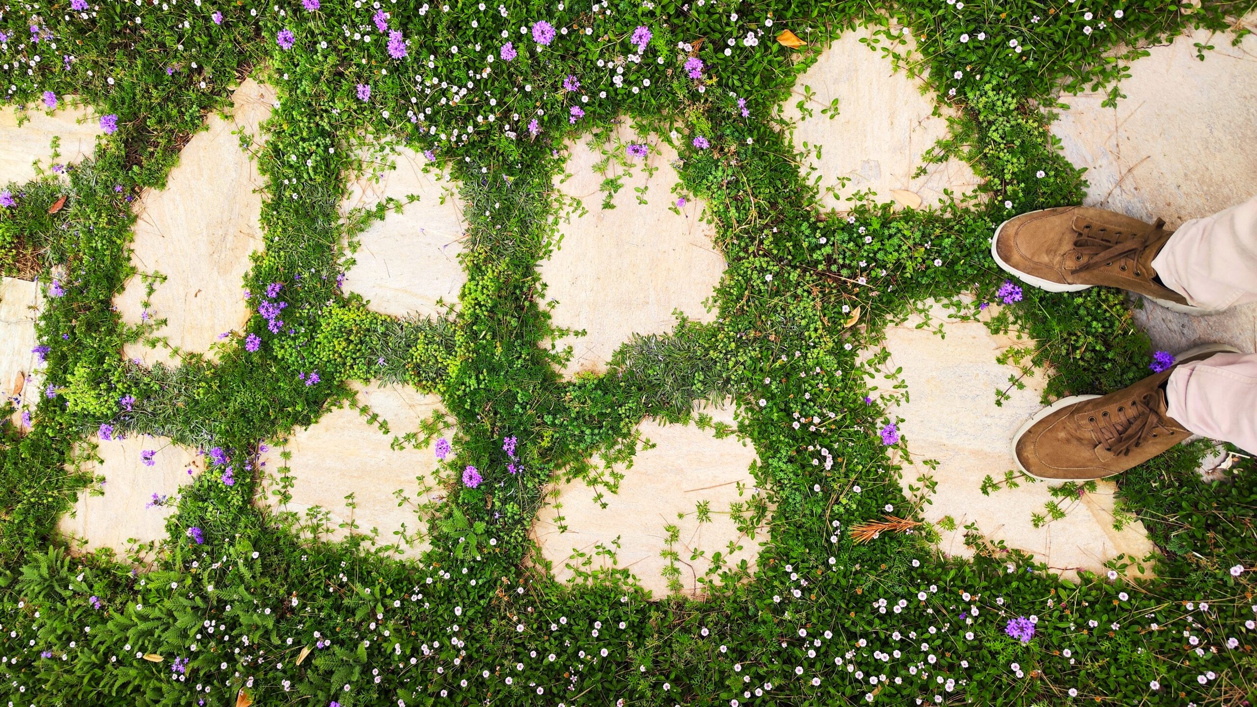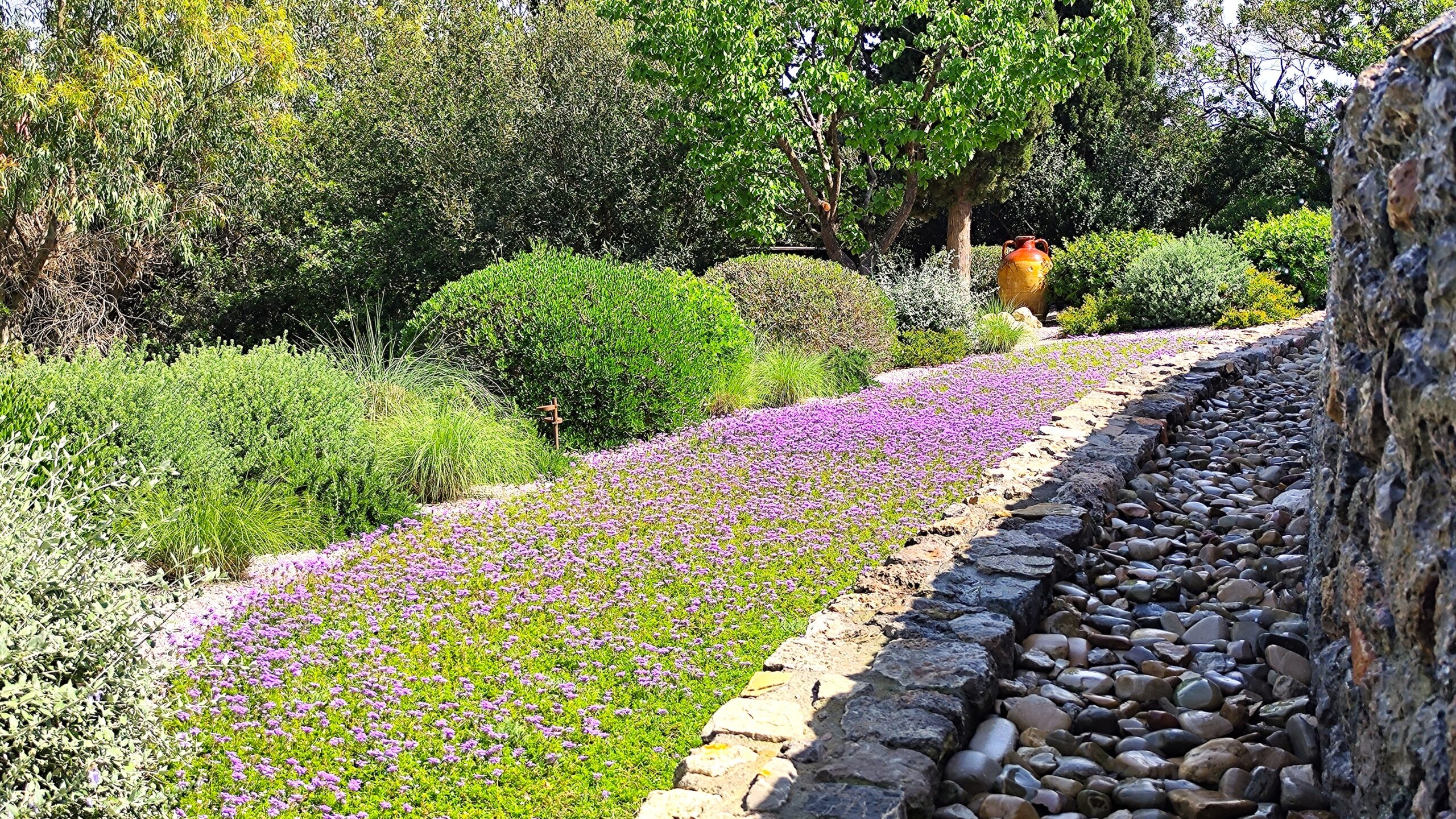 Phyla nodiflora, Dymondia margaretae e Sedum ‘Coral Carpet’ corrono tra le pietre dei camminamenti, tessendo una trama compatta. Ad esse si uniscono Achillea crithmifolia e Verbena x hybrida, che regalano fioriture e movimento.